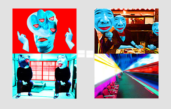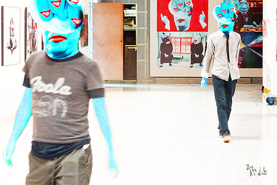 着ぐるみのマスクを脱いでポーズをとる自画像