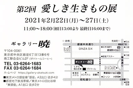 第2回愛しき生きもの展 2021 イキモノのための風景 2021年2月22日(月)〜2月27日(土) ギャラリー暁にて開催。
