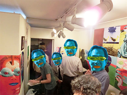 着ぐるみのマスクを脱いでポーズをとる自画像