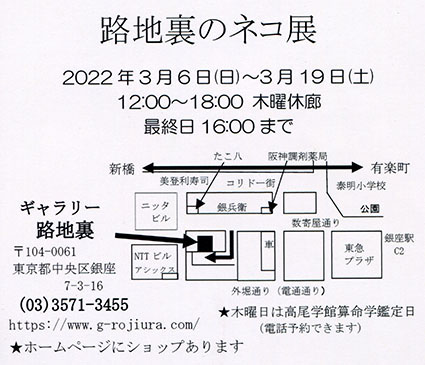 路地裏のネコ展2022 「自画像」 路地裏のネコ展に参加。 2022年3月6日(日)〜3月19日(土) 104-0061 東京都中央区銀座7-3-16 03-3571-3455 ギャラリー路地裏にて開催。