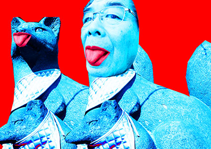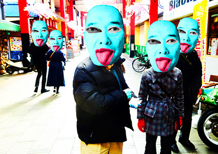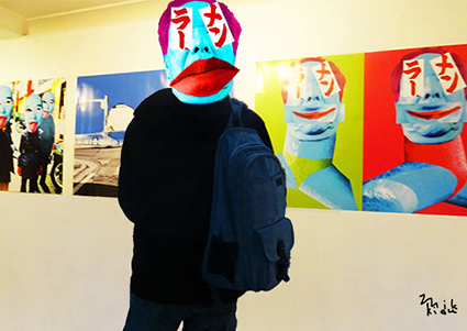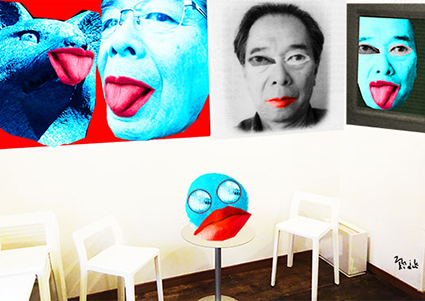 着ぐるみのマスクを脱いでポーズをとる自画像