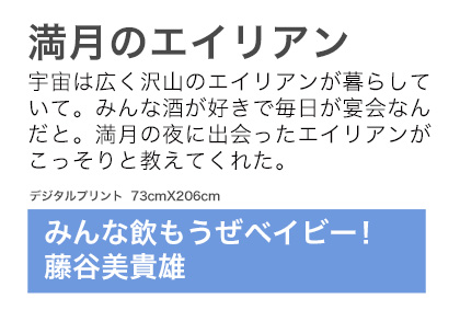 第17回東京展・春季会員展 2024 「満月のエイリアン」 今年で17回目になる東京展・春季会員展に参加。 2024年2月19日(月)〜2月24日(土) 104-0061 東京都中央区銀座6-13-6 商工聯合会ビル2F 03-6264-1683 ギャラリー暁にて開催。